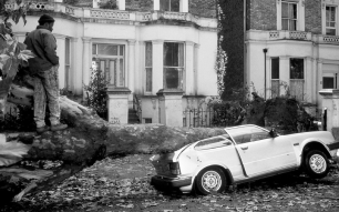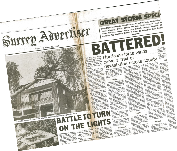 The storm blew through a house near Esher, caving in its windows and emptying the contents of the front room all over the lawn and into the road